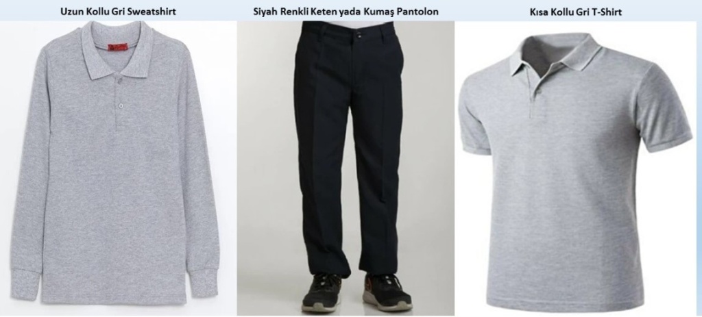 Üzerinde herhangi bir marka, kurum veya kuruluşa ait yazı, logo veya amblem içeren kıyafetler kesinlikle giyilmeyecektir. Sweatshirt, tshirt (polo, sıfır yaka) veya pantolon Ortaöğretim Kurumları Kılık Kıyafet Yönetmeliği’ne uygun ölçülerde olacaktır. (Rengi siyah da olsa tayt, şort, crop, alt eşofman, yırtık, delikli, şeffaf kıyafetler, kolsuz tişört veya gömlek giymek Yönetmelik’e aykırıdır.)
